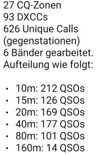 Vergangenes Wochenende, 25.+ 26.10.25, wagte sich DL3O zum ersten Mal ‚halbwegs‘ ernsthaft am CQ-WW-DX-Contest (cqww.com) auf 10-160m, ohne WARC-Bänder, teilzunehmen. Fünf OM’s von JO30 waren Samstag + Sonntag insgesamt 24h qrv und konnten rund 800 QSO’s loggen. 27 CQ-Zonen, 93 DXCC’s und 626 Unique Calls (Gegenstationen) auf sechs Bändern wurden gearbeitet. 10m: 212 QSOs 15m: …